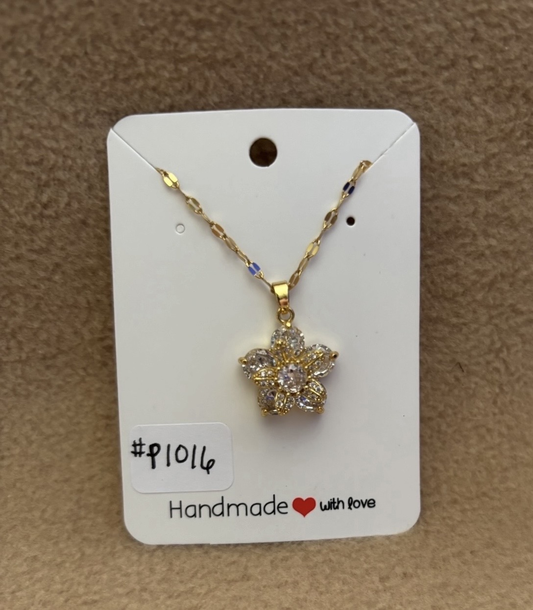 Here is a clear flower fidget. The top flower spins with the use of your finger. The flower is white rhinestones. The flower back and chain is gold color. The chain is 15” with a 2” extension. If you want to see a video of the flower spinning please go to my Facebook page Colorful Crafts WI.
