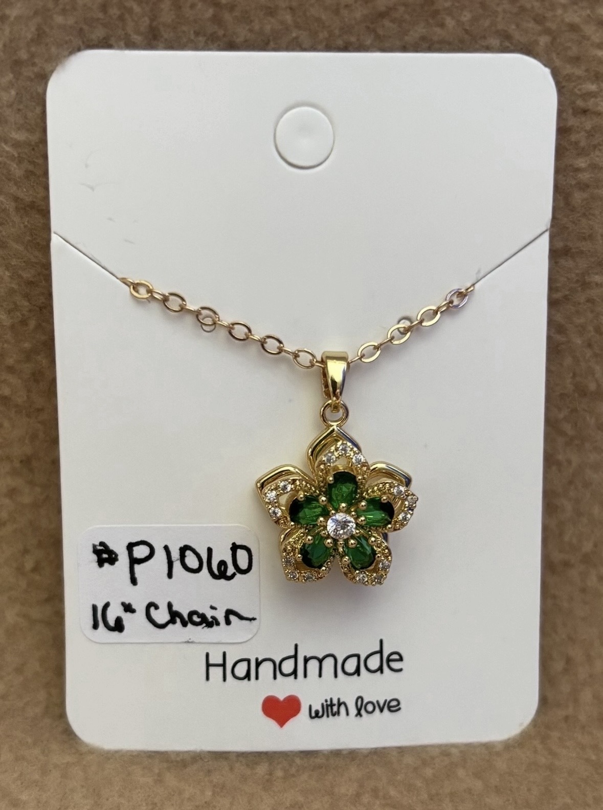 Here is a green flower fidget. The top flower spins with the use of your finger. The flower is green and white rhinestones. The flower back and chain is gold color. The chain is 15” with a 2” extension. If you want to see a video of the flower spinning please go to my Facebook page Colorful Crafts WI.