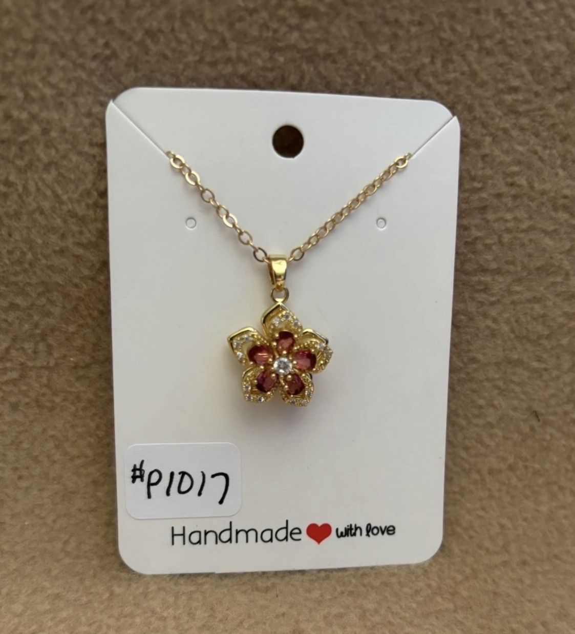 Here is a pink flower fidget. The top flower spins with the use of your finger. The flower is pink and white rhinestones. The flower back and chain is gold color. The chain is 15” with a 2” extension. If you want to see a video of the flower spinning please go to my Facebook page Colorful Crafts WI.