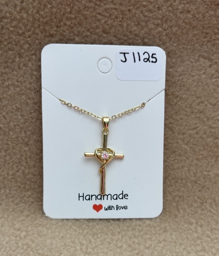 Here is a gold heart cross necklace. There is an heart symbol in the middle of the cross. There is a rhinestone in the middle of the cross. The cross and chain is gold tone. The chain is 17” long.