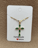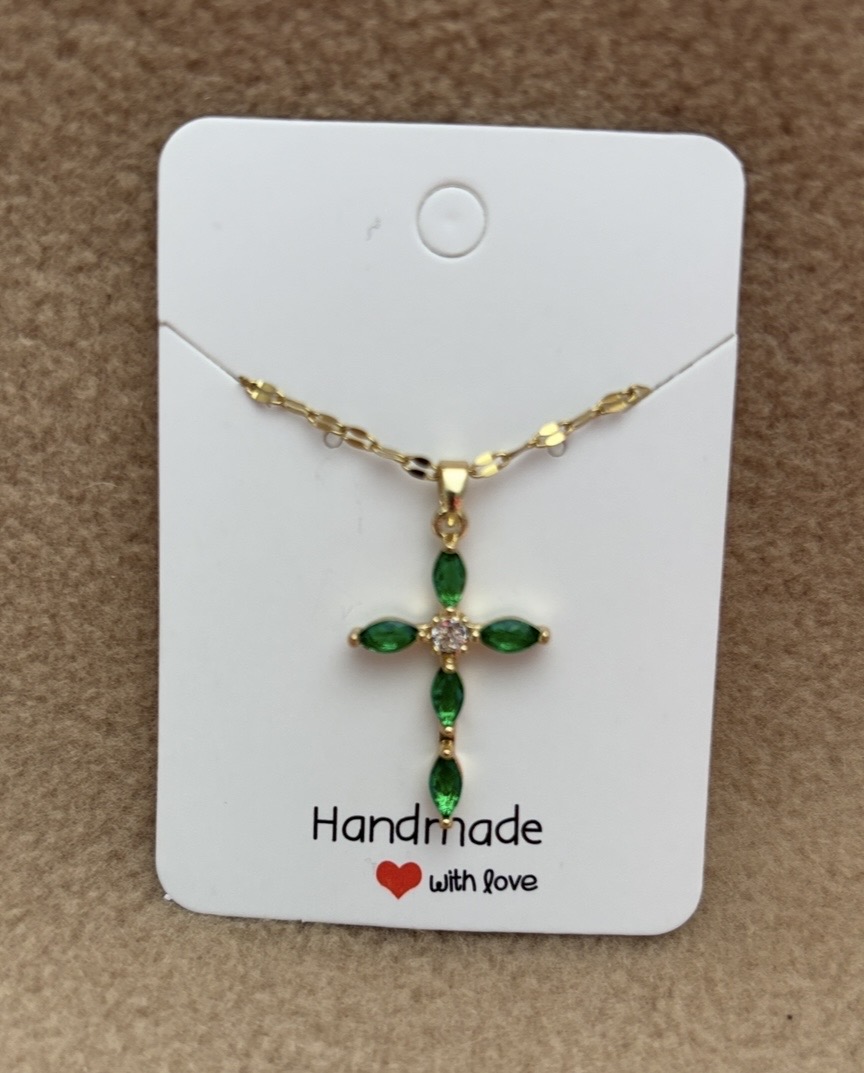 Here is a green stone cross necklace. There is green stones on the cross and a rhinestone in the middle of the cross. The cross and chain is gold tone. The chain is 15” with a 2” extension chain.