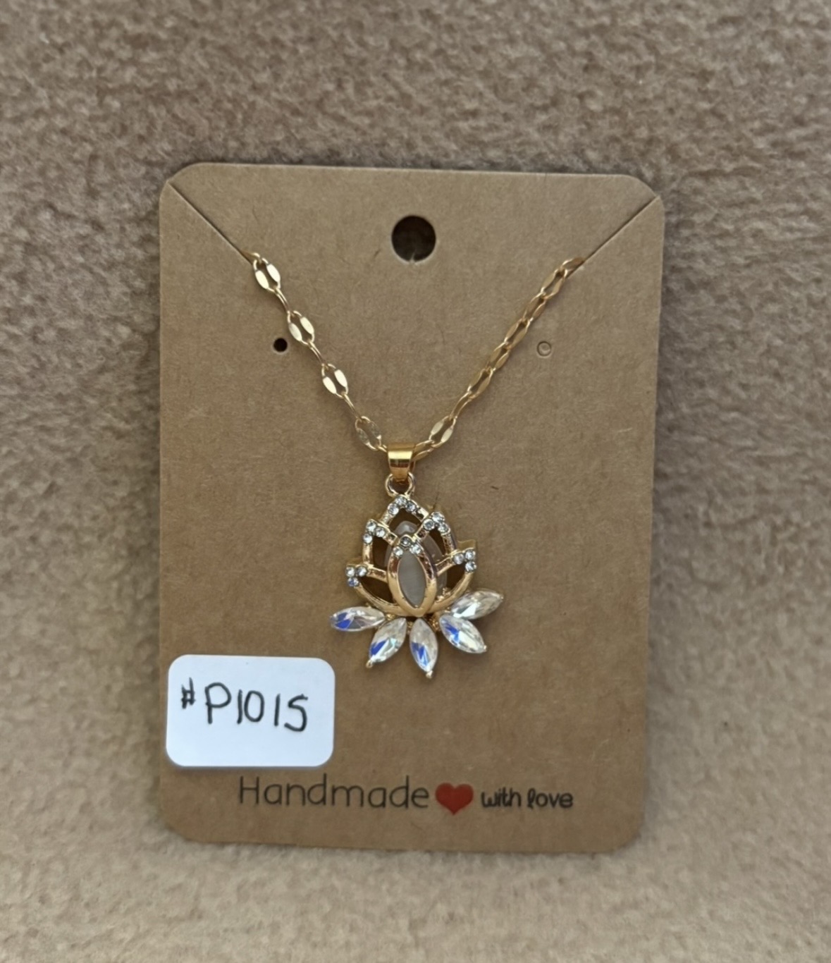 Here is a lotus flower necklace. The middle flower pedal has a white cat eye bead. The the tips of the pedals has white rhinestones. The leaves of the flower is white rhinestones. The charm and chain is gold color. The chain is 15” with 2” extension chain.