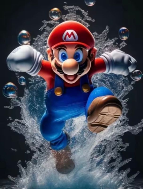 I have a Mario Splashing In Water Diamond Painting. Size is approximately 20cm by 30cm. This is a full picture with round diamond dots. The kits come with a picture, diamond dots, tray, tool and wax.