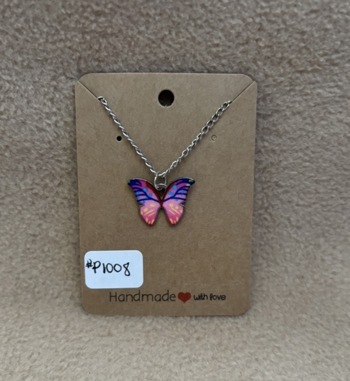 Here is a pink and blue butterfly. The background of the is pink with blue spots on the top wings and yellow spot on the bottom wings. The back of the butterfly is silver tone and the chain is silver tone. The chain is 19” with a 2” extension chain.