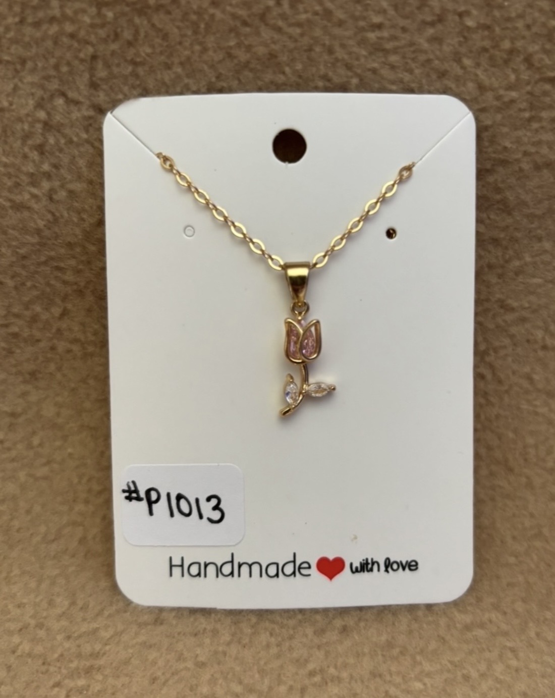 Here is a pink tulip necklace. The leafs are a clear stone. The flower charm and chain are gold color. The chain is 16” with 2” extension chain.