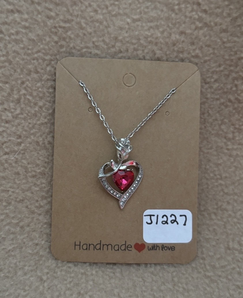 Here is a red heart necklace. The heart has clear rhinestones. There is a red heart rhinestone in the middle with a rose on top of the heart. The chain is 17” with a 2” extension chain.