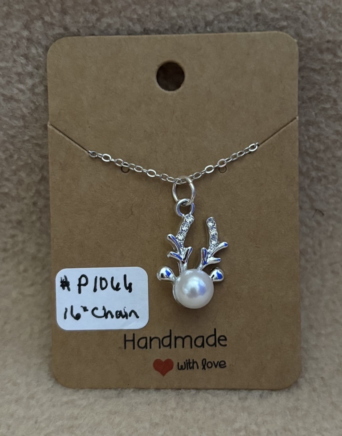 Here is a Reindeer Necklace. There head is a white pearl. The antlers has rhinestone on it. The charm and chain is sliver color. The chain is 16”.