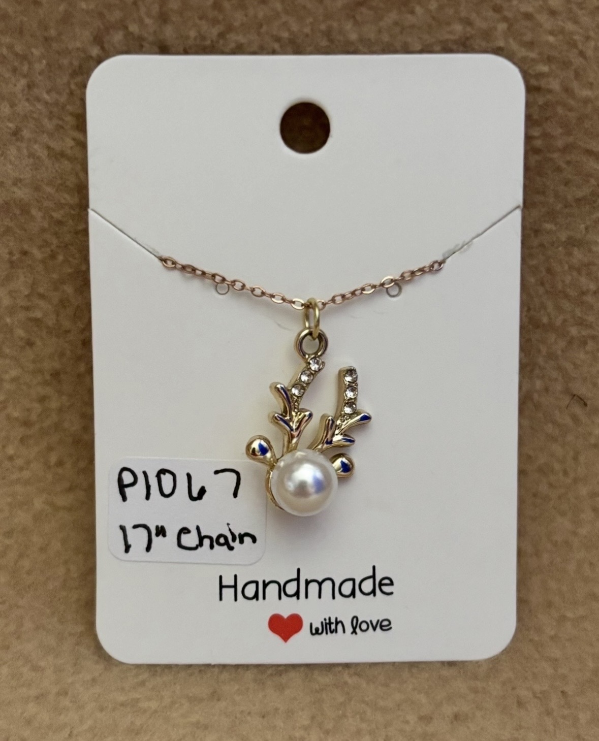 Here is a Reindeer Necklace. There head is a white pearl. The antlers has rhinestone on it. The charm and chain is gold color. The chain is 17”.
