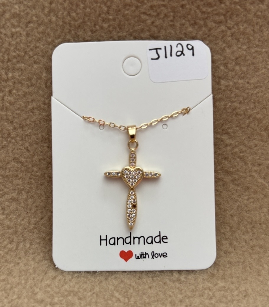 Here is a Rhinestone Cross Heart Necklace. There is rhinestone on the cross and heart. The cross and chain is gold tone. The chain is 15” with a 2” extension chain.