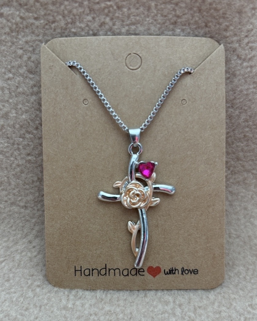Here is a rose cross necklace. The rose is rose gold with a dark pink heart above the rose. The cross and chain is silver color. The chain is 17” with a 2” extension chain.