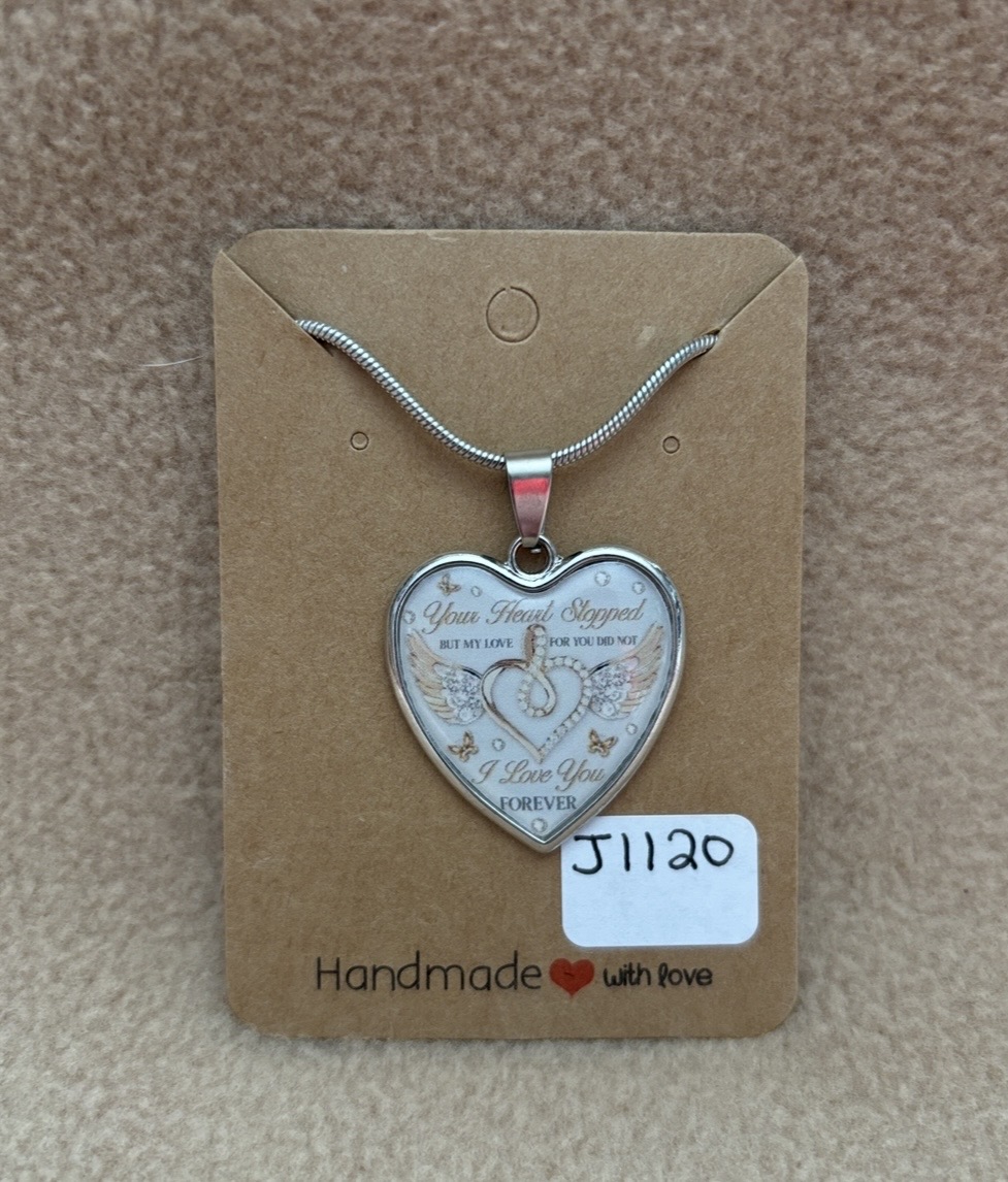 Here is your heart stop necklace. The necklace says Your Heart Stopped But My Love For You Did Not I Love you Forever. It is a heart shape charm. In the middle of the heart there is a heart with wings. The charm and chain is silver tone. The chain is 16” with a 2” extension chain.